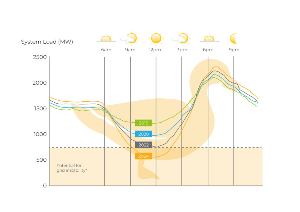 Cada año se añade más energía solar en Holanda. Durante el día, cuando brilla el sol, a menudo tenemos un excedente de electricidad. Pero por la tarde, cuando todo el mundo llega a casa y la demanda de electricidad alcanza su punto máximo, el sol ha desaparecido. Este fenómeno se conoce como la «curva del pato», un gráfico que muestra la demanda neta de electricidad, con la forma de un pato creada por la caída durante el día y el pico pronunciado por la tarde.